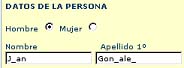 Pertsonaren izena eta abizenak. Hitzez hitz sartu behar dira, nahiz eta sistemak aukerak eskaini zalantzagarritzat dituzun karaktereak ordezkatzeko (Ikusi Kontsultarako Laguntzak).