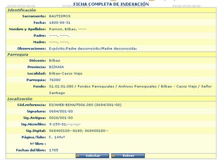 >> Bilaketaren emaitza behar bezalakoa izan bada, nahi diren datuak kontsultatzeaz gain, artxiboan eska ditzakezu datuok, bidezko eskakizunak betez.